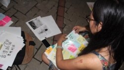 2019年7月2日,一些志愿者正在整理保存示威活动现场参加者留下的贴纸(美国之音记者申华拍摄)