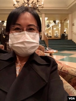 在洛杉矶圣安妮塔公园投票站,美国之音记者雨舟正在等待进行美国之音大选夜电视连线报道。