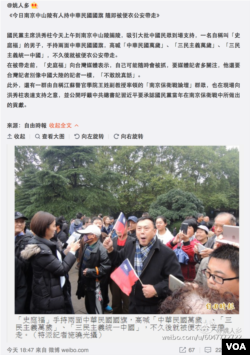 一些民众在中山陵打出“台湾大陆一家亲,欢迎你洪秀柱主席”的标语,有人高呼“打到蔡英文”、“蔡英文不得好死” 等口号。也有民众举着青天白日旗,高喊“中华民国万岁”、“三民主义统一中国”等被当局视为敏感的口号,随即被现场便衣带走,凸显两岸制度不同和言论自由方面的差异。台湾自由时报报道说,手举着两面青天白日小旗的男子自称名叫史庭福。微博上有网友呼吁洪主席会见习总书记时过问过问史庭福的情况。